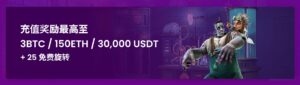 在欢迎优惠方面,你总共会收到最多 3BTC 和 25 次免费转动!忘掉任何的促销代码,但别忘记存入 BTC/ETH/USDT 等加密货币之一,才能抱走大笔红利。详细资讯如下。